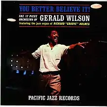 You Better Believe It! is an album by Jazz musician and bandleader Gerald Wilson. Recorded in 1961 for the Pacific Jazz label,[1] it featuring a 17 piece orchestra, the music is arranged, directed and mainly composed by Wilson. The orchestra is made up of west coast-based musicians such as Richard "Groove" Holmes, Harold Land, and Carmell Jones.