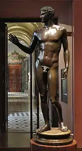The bronze statue shows a naked youth standing still, of about life size (1.85 metres high, 6'1"). In its contrapposto stance, the right leg is load-bearing, while the left is free, barely touching the ground with its toes. The left arm hangs free, the right hand is held out at shoulder height. The head is turned slightly to the right, following the gesture of the right hand.