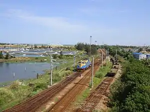 The Guangdong–Hainan railway or Yuehai railway (Chinese: 粤海铁路; pinyin: Yuè-Hǎi tiělù)[2] is a railway that operates from Haikou railway station in Hainan, via South Port, a few hundred metres north-west on the coast, and the Qiongzhou Strait ferry, to Zhanjiang, at the tip of the Leizhou Peninsula in Guangdong, and then north into Guangdong.