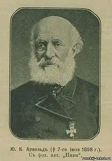 Yuri Karlovich Arnold, also Jury, Georgy, Yourij, and Arnol't, Arnol'd (Russian: Юрий (Георгий) Карлович Арнольд; November 13, 1811 – July 20, 1898), was a Russian composer, musicologist, music critic, choral conductor, theorist and music educator. There is some speculation that he was employed by the tsarist police and that some of the writings attributed to him were actually written by Peshenin, who was paid to keep it a secret. Also that some of his theories on the history of Russian church music are now seen as false. Among his students were Allemanov and Yu Mel’gunov.[1]