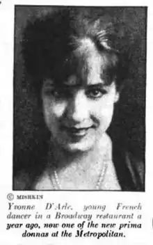 - ↑ "Yvonne D'Arle Leaves Metropolitan". St. Louis Post-Dispatch. October 3, 1926. p. 67. Archived from the original on 30 March 2018. Retrieved 30 March 2018. via Newspapers.com