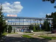 At the height of its activity, the plant occupied an area of 484 hectares (1,200 acres), criss-crossed with 120 kilometres (75 mi) of roads, 70 kilometres (43 mi) of railway sidings and 200 kilometres (120 mi) of high-voltage power grids. In 1976, the site had a workforce of 7278 people and a further 6000 worked in subcontracted companies. The premises also comprised, inter alia, a specific bus transport system, a school, a canteen, a clinic, a community center, a sports club, a stadium, a hall, a cinema, a newspaper, a printing house, workers' hotels, a fire brigade, a pig house and even its own railway station ("Bydgoszcz Żółwin").[20] Furthermore, factory blocks were added in the neighbouring "Osiedle Awaryjne". The two gates of the plant (at Wojska Polskiego and Hutnicza streets) were connected in 1953 with a tram line. The company's had a dedicated House of Culture, located next to the boat racing track on the Brda River. The facility had a common room, a library and a reading room and was equipped with musical instruments for an entire orchestra. Two fully equipped gymnasiums were built next to the House of Culture.[5]