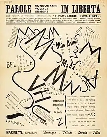 Zang Tumb Tumb (usually referred to as Zang Tumb Tuuum) is a sound poem and concrete poem written by Filippo Tommaso Marinetti, an Italian futurist. It appeared in excerpts in journals between 1912 and 1914, when it was published as an artist's book in Milan. It is an account of the Battle of Adrianople, which he witnessed as a reporter for L'Intransigeant. The poem uses Parole in libertà (words in freedom; creative typography) and other poetic impressions of the events of the battle, including the sounds of gunfire and explosions. The work is now seen as a seminal work of modernist art, and an enormous influence on the emerging culture of European avant-garde print.[1]