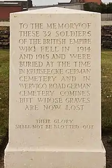 It holds the remains of 1,583 Allied soldiers who died during the First World War.[2] Of these, 1,524 were British, 22 were from Canada, two from Australia and a sole Indian is interred in the cemetery. Most were buried by the Germans in the aftermath of the fighting in October 1914 and their identities were lost;[1] 1,135 of them are recorded as being unknown.[2] The cemetery also holds the remains of a British airman killed in 1941, during the Second World War.[3]