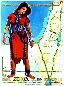 Zarqa is a 1969 Pakistani epic historical drama film directed, produced and written by Riaz Shahid while the music is composed by Rashid Attre and Wajahat Attre. It features Neelo, Alauddin, Ejaz Durrani, Saqi and Nasira as protagonist characters.[2] It is based on the life of Zarqa, a Palestinian dancer girl and a freedom activist, who killed herself for the liberation of Palestine involving Israeli-occupied territories and Palestinian liberation movement.[3] It also addresses a real event of Neelo when she was forcibly invited by Nawab Malik Amir Mohammad Khan, the governor of West Pakistan to his office to perform a stage dance during the 1965's official visit of Mohammad Reza Pahlavi to Pakistan.[4]