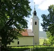 The local church, built on the hillside north of the village, is dedicated to Saint Anthony of Padua and belongs to the Parish of Dobrepolje–Videm.[8] The church was established in the second half of the 17th century. In the mid-19th century it was painted with frescoes by Štefan Šubic (1820–1884).[7][5] The church was damaged and burned during bombing in 1944. Among the furnishings, the local people were able to save a statue of Saint Anthony of Padua, the tabernacle, and a pew. Permission to restore the church was not obtained until after Slovenia became independent. The paintings in the church were restored in 1991 by the painter Izidor Mole, assisted by Tine Šporar from Podpeč.[9]