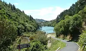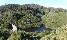 Historically about 60% of the Wellington region was covered with broadleaf forest. Karaka, kohekohe, ngaio and nīkau trees were common but there were also rātā, rewarewa and tawa with occasional podocarps like kahikatea and rimu.[5] The whole sanctuary valley was covered with this sort of forest until European settlement of the area and the large fires in 1850 and 1860 that cleared the land to be used for farming. The lower reservoir, retained by an earth dam, was completed in 1878.[6] Parts of the area continued to be farmed up until 1906 when the remaining catchment was purchased for the water works.[6] The upper reservoir, retained by a concrete gravity arch dam, was completed in 1908.[7] From this point, as the whole valley was a protected water catchment area for Wellington city, the slopes were re-vegetated with introduced trees and the native forest also began regenerating. The upper dam was decommissioned as a reservoir about 1991, the lower one in 1997.[6]