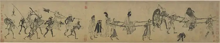 Gong Kai's Zhongshan Going on Excursion (13th or 14th century), depicting Zhong Kui and his sister setting out on a hunting expedition, with a retinue of subjugated demons carrying Zhong Kui's sword, household goods, pots of wine, and even smaller demons that they have captured