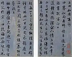 Another physical practice is calligraphy, the writing of characters. This writing is a bodily act. The writing of a character is not an intellectual inquiry, but "a performance of it".[17] Zhongfeng Mingben was a celebrated calligraphy artist.[18]