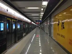 Zhongsheng station (simplified Chinese: 中胜站; traditional Chinese: 中勝站; pinyin: Zhōngshèng Zhàn) is a railway station on Line 10 of the Nanjing Metro. When it began operations on 3 September 2005,[1] it was part of Nanjing Metro Line 1's Phase I[2] from Maigaoqiao to Olympic Stadium. On 1 July 2014,[3] with the opening of Line 10, the former branch of Line 1 from Andemen to Olympic Stadium became re-designated as Line 10.[4] On 28 December 2023, with the openling of the Southen part of Line 7, it became an interchange station between Line 7 and Line 10.[5]