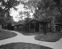 • Western Cabins Also known as "Deluxe Cabins, the duplex and quadruplex cabins built in a substantial manner with massive stone piers and fireplaces and open log truss ceilings. Infill walls are built in the studs out style. The Western Cabins were built beginning in 1927.[2]