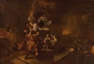 The ambiguous or fragmentary nature of the verses leaves much room for extrapolation, and rabbinical scholarship has provided a number of explanations. The earliest Jewish interpretations almost unanimously infer that Moses failed to circumcise his son, thereby angering God and provoking the attack, but Zipporah's quick action in circumcising her son appeases God and ends the confrontation.[3] The Talmud understands this episode to underscore the primacy of the biblical command for fathers to promptly circumcise their sons (either on the eighth day or at the first opportunity thereafter), such that even someone of Moses's accrued merit and stature was not exempt from punishment by death for delaying his son's circumcision even briefly.[4]