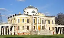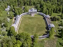 The architectural ensemble of the estate includes the manor's house and an oval-shaped colonnade connected to the side wings and a double dome above the central hall. the facade on the park side aligns with the river; the park includes a pond with an man-made island and pathways.[3] Most of the pavilions and gazebos from the manor park have been lost.
