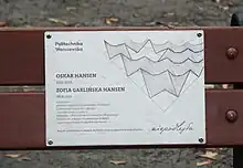 Commemorative plaque celebrating Zofia and Oskar placed on bench in the main courtyard of the Warsaw University of Technology.