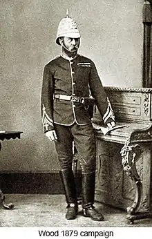 British forces invaded Zululand in January 1879, during the Anglo-Zulu War. The advance was made in three columns, a left column under Lieutenant-Colonel Evelyn Wood, a centre column under Lieutenant-General Frederic Thesiger, 2nd Baron Chelmsford and a right column under Colonel Charles Pearson. Wood was tasked with advancing into north-western Zululand.[1] He commanded a force of around 2,500 men. His fighting forces included eight companies of regular infantry from the 13th and (Wood's own) 90th Regiments of Foot, six artillery pieces from No 11 Battery, 7th Brigade, Royal Artillery and around 300 black auxiliaries known as Wood's Irregulars. Wood's column also included around 200 mounted white irregulars under Lieutenant-Colonel Redvers Buller.[2]