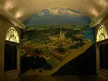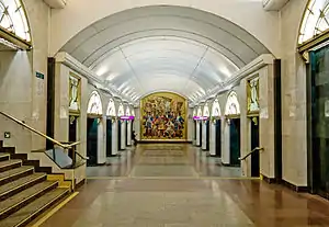 At station mosaic panels from smalt with the image of the very first soldiers of Semyonovsky regiment serving at the time of reign of Peter the Great are established. They are executed in masterful Russian Academy of Arts,[7] the author is artist Alexander Bystrov.[8]