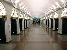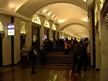 The station original project was executed by Russian architect Alexander Konstantinov,[5] but after opening it has been declared that authors of the project is the group of architects of Open Society "Lenmetrogiprotrans" led by N. V. Romashkin-Timanov: Н. V. Romashkin-Timanov, Ю. V. Eechko, D. A. Bojtsov, N. A. Vinogradova.[6]
