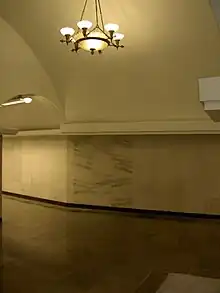The subjects of decorating of underground part of station also are devoted the Semyonovsky regiment (which its barracks settled down around a station exit on a surface). The floor is built from green granite Rakhi Green (India) with colour inserts and a fringing from red granite Imperial Red (India). Walls are revetted by marble of Koelga, Kashin's granite mountain and dark green marble Indiana Green (India).[2] The choice of the supplier and stone from India was made by the best expert in a natural stone Vladimir Shestakov.