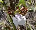 This orchid's generic name, derived from the Greek word zugón, means "yoke". It refers to the yoke-like growth at the base of the lip.