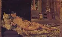 Manet, 1863: 'Olympia', oil on canvas; (model was the woman-artist Victorine Meurent); - quote of Zola, 1863: 'When our artists give us Venuses, they correct nature, they lie. Manet asked himself why lie, why not tell the truth; he introduced us to Olympia, this fille (prostitute) of our time, whom you meet on the sidewalks'
