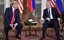 The 2018 Russia–United States summit was a summit meeting between United States President Donald Trump and Russian President Vladimir Putin, also known as the Trump–Putin summit which was hosted by the President of Finland Sauli Niinistö in Helsinki, Finland on 16 July 2018. The Finnish Ministry of Foreign Affairs officially titled the summit as the #HELSINKI2018 Meeting. Stated issues included improving bilateral ties between the two countries which had been deteriorating since the annexation of Crimea by Russia in 2014 and development of the U.S. Intelligence Community's assessment that Russia tried to meddle with the results of the 2016 U.S. elections.