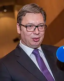 Aleksandar Vučić (Serbian: Александар Вучић) (born 5 March 1970) is a Serbian politician serving as the president of Serbia since 2017 and as the president of the populist Serbian Progressive Party (SNS) since 2012. Vučić served as the Prime Minister of Serbia in two terms, from 2014 to 2016 and from 2016 until 2017, as well as the deputy prime minister from 2012 until 2014. Furthermore, Vučić served as a member of the Serbian parliament, Minister of Information from 1998 to 2000, and later as Minister of Defence from 2012 to 2013.