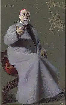 Anatole France (16 April 1844 – 12 October 1924), born Jacques Anatole François Thibault, was a French poet, journalist, and novelist. Ironic and skeptical, he was considered in his day the ideal French man of letters. A member of the Académie française, he won the 1921 Nobel Prize in Literature in recognition of his literary achievements. He is widely believed to be the model for the narrator's literary idol "Bergotte" in Marcel Proust's In Search of Lost Time.