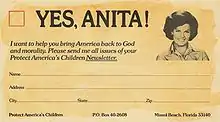 - During Bryant's campaign, she invoked religious and morality arguments into her speeches and political commercials. These arguments were often built on her underlying assumption that being gay was morally wrong. Knowing that she could not simply rely on demonizing gays, she tried to develop a message that was both secular and promoted a goal that would be uniformly accepted-that nothing should be done to harm children... To show how overturning the gay rights law would promote this seemingly neutral goal, she needed to show how gays were harmful to children. The central part of this argument was that because gays and lesbians could not have children naturally, they would need to recruit children to be gay, which was morally unacceptable. To show how the fight against the Dade County ordinance was based on protecting the children, Anita Bryant and her husband named the group "Save Our Children."