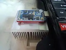 ASICMINER USB Block Erupter - Bitcoin mining device with an ASIC (application-specific integrated circuit; the chip on the bottom-left of the picture).