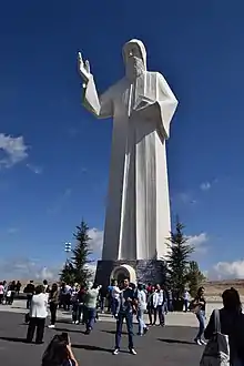 Statue of St. Charbel Makhlouf in Faraya, Lebanon and visitors of the monument.
