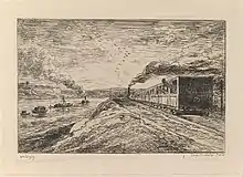 Daubigny, 1862: 'The Boat Studio, from series 'Voyage en Bateau', 1862', etching; first state of two; location: Metropolitan Museum of Art, Drawings and Prints, New York City - quote by Albert Wolff - journalist, c. 1880: about the studio-boat of Daubigny: 'The boat used by Daubigny was arranged for long voyages; the cooking was done on board; there was a good wine cellar; you drank deep and you worked hard. The sketches accumulated, and when winter was come, Daubigny returned to Paris..'