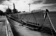 - Graham: As a matter of fact, there she is right now: your new boat. [Dodge turns to look; a rusty old submarine is tied up at the pier.] USS Stingray, SS-161.