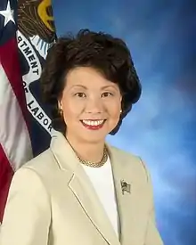 Elaine Lan Chao (born March 26, 1953) is an American businesswoman and politician. A member of the Republican Party, Chao served as Secretary of Transportation in the Trump administration from 2017 to 2021, and as Secretary of Labor in the Bush administration from 2001 to 2009.