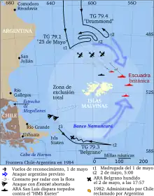 The deployment of Ar+Br naval forces around the Falklands Islands before the sinking of the ARA Belgrano during the Falklands War