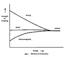 - If grand unified theories are correct, we ought to be able to derive the relative power of the strong, weak, and electromagnetic interactions at accessible energies from their presumed equality at much higher energies. When this is attempted, a wonderful result emerges. ...in the form first calculated by Howard Georgi, Helen Quinn, and Steven Weinberg ...The couplings of strong-interaction gluons decrease, those of the [weak interaction] W bosons stay roughly constant, and those of the [electromagnetic interaction] photons increase at short distances [or high energies]—so they all tend to converge, as desired.
