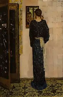 - When, as he recently did [c. 1894-95] Breitner is painting a girl in a Japanese dress, then he is not interested in the costume, the masquerade-side of the representation, in the more or less pure ethnological authenticity, - but he is struck first and foremost by the beautiful contrast that such a white or vermilion-red rich embroidered dress creates against a dull black piece of furniture, a golden-yellow pillow or a lavishly colored oriental carpet. (translation from the original Dutch: Fons Heijnsbroek)