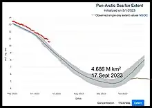 - On September 17 of this year we bottom out at... about 4.7 million km2 of ice floating on the Arctic ocean... [T]he forecast has been below the actual data... So this is great news and... I recommend that you track it... because it will give you a good idea [of] when an ice-free Arctic Ocean will occur, and therefore when we are likely to lose habitat for most, if not all species on Earth.