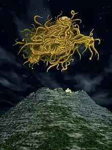 - It was an All-in-One and One-in-All of limitless being and self — not merely a thing of one Space-Time continuum, but allied to the ultimate animating essence of existence's whole unbounded sweep — the last, utter sweep which has no confines and which outreaches fancy and mathematics alike. It was perhaps that which certain secret cults of earth have whispered of as YOG-SOTHOTH, and which has been a deity under other names; that which the crustaceans of Yuggoth worship as the Beyond-One, and which the vaporous brains of the spiral nebulae know by an untranslatable Sign...