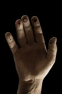 Hands are prehensile, multi-fingered extremities located at the end of an arm or forelimb of primates such as humans, chimpanzees, gorillas and orangutans. Hands are the chief organs for physically manipulating the environment, used for both gross motor skills (such as grasping a large object) and fine motor skills (such as picking up a small pebble). The fingertips contain some of the densest areas of nerve endings on the body, are the richest source of tactile feedback, and have the greatest positioning capability of the body; thus the sense of touch is intimately associated with hands.