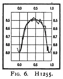 - The range of H 1255 is only four tenths of a magnitude, and on account of its brightness it is difficult to observe on all plates except those taken with the 1-inch Cooke lens. It seemed necessary, therefore, to take unusual precautions in order to secure accurate observations, and to give each one its full weight. Accordingly, one hundred and thirty six photographs were selected, including nearly all of those taken with the Cooke lens, and also those taken with the 8 inch Bache Telescope on which the variable was certainly faint. Four independent estimates of brightness were made on each plate, and means were taken, thus reducing the probable error one half. The phase was computed for each observation, thus covering all parts of the light curve. ...H 1255 and H 1303 differ from the other variables in a marked degree as in each case the duration of the phase of minimum is very long in proportion to the length of the period. This fact led to considerable difficulty in determining their periods as they were apparently at their minimum brightness for some time before and after the actual minima occurred. In H 1255, the change in brightness is obviously continuous throughout the period, although it is much more rapid near minimum than near maximum. This is clearly seen in Plate IV, Figs. 5 and 6.