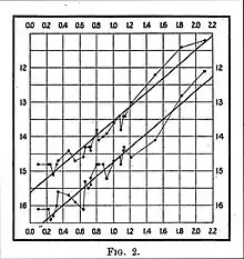 - A remarkable relation between the brightness of these [Cepheid] variables and the length of their periods will be noticed. In H.A. 60, No.4, attention was called to the fact that the brighter variables have the longer periods, but at that time it was felt that the number was too small the drawing of general conclusions. The periods of 8 additional variables which have been determined since that time, however, conform to the same law. The relation is shown graphically in Figure 1... The two resulting curves, one for the maxima and one for the minima, are surprisingly smooth, and of remarkable form. In Figure 2, the abscissas are equal to the logarithms of the periods, and the ordinates to the corresponding magnitudes, as in Figure 1. A straight line can readily be drawn among each of the two series of points corresponding to the maxima and minima, thus showing that there is a simple relation between the brightness of the variables and their periods. The logarithm of the period increases by about 0.48 for each increase of one magnitude in brightness.