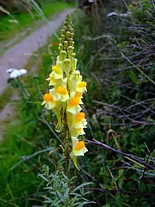 - Common toadflax (Linaria vulgaris) is a curiously shaped flower that gives rise to the name 'cod's head' in Norwegian, and in dialect nomenclature it has been likened to a variety of other animals' mouths: dog, rabbit, mouse, lion, monkey and so on. Its colouration accounts for the alternative English name of butter-and-eggs; the eggyolk-orange part gets darker as it matures. The plant can become very invasive and is regarded as a weed. Being hard to distinguish amongst true flax until it flowered it was awarded a pejorative affiliation with toads.