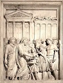 Caesar Marcus Aurelius (C.E.161-180) and members of the Imperial family offer sacrifice in gratitude for success against Germanic tribes.