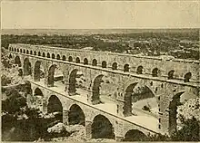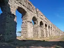 The Roman aqueduct is the type of aqueduct built in ancient Rome, that supplied fountains, latrines, public baths, and private households; it also supported farms, gardens, milling, and mining operations. Rome's first aqueduct was built in 312 BC. By the 3rd century AD, the city had [[List of aqueducts in the city of Rome|eleven aqueducts]. Cities and towns throughout the Roman Empire emulated this model, and funded aqueducts as objects of public interest and civic pride
