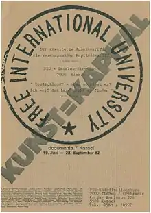 - Only on condition of a radical widening of definitions will it be possible for art and activities related to art [to] provide evidence that art is now the only evolutionary-revolutionary power. Only art is capable of dismantling the repressive effects of a senile social system that continues to totter along the deathline: to dismantle in order to build ‘A SOCIAL ORGANISM AS A WORK OF ART’… EVERY HUMAN BEING IS AN ARTIST who – from his state of freedom – the position of freedom that he experiences at first-hand – learns to determine the other positions of the TOTAL ART WORK OF THE FUTURE SOCIAL ORDER.