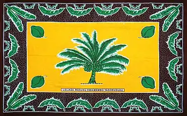 A traditional kanga with a Swahili proverb written upon it, which reads: Usijaze masusu kwa mambo yasokusuhu. English translation: Do not get involved in matters that do not concern you.