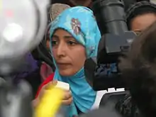 Tawakkol Karman (born 7 February 1979) is a Yemeni journalist, politician and senior member of the of Al-Islah political party, and human rights activist. She was co-recipient of the 2011 Nobel Peace Prize, along with Leymah Gbowee and Ellen Johnson Sirleaf.