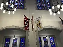 On the right shank of the ring are found the United States and South Carolina colors, which depict the unity of the state and federal government. The cannon balls at the bottom of this shank serve the dual purpose of representing the artillery, one of the two original branches of military instruction given during the early years of The Citadel, and as a continuing link between the Old Citadel on Marion Square and the Greater Citadel. When the college moved to its present location, the Civil War cannon balls piled before the Old Citadel were left behind. The oval crest has a reproduction of the palmetto tree in its background. Aside from representing the state tree of South Carolina, the Palmetto symbolizes a cadet-trained regiment of infantry that fought in the Mexican War and it represents a fort, built of Palmetto logs, that repelled a large British invasion fleet during the Revolutionary War. The two oval shields at the base of the tree are replicas of the state seals.- The Citadel Alumni Association, "The Ring"