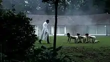 - I'm Dr. Josef Heiter, retired, but still very well known as the leading surgeon in separating Siamese twins. Six months ago, I designed a never-seen operation, not separating any more but creating. I transformed my three Rottweilers into a beautiful three-hound construction. Good news, your tissues match. So, I'll explain this spectacular operation only once. We start with cutting the ligamentum patella, the ligaments of the kneecaps, so knee extension is no longer possible. Pulling from "B" and "C" the central incisors, lateral incisors and canines from the upper and lower jaws, the lips from "B" and "C," and the anus of "A" and "B," are cut circular along the border between skin and mucosa, the mucus cutaneous zone. Two pedicelated grafts are prepared and lifted from the underlying tissue. The shaped incisions below the chins of "B" and "C" up to their cheeks connecting the circular mucosa and skin parts of anus and mouth, from "A" to "B," and "B" to "C," connecting the pedicelated grafts to the chin-cheek incisions from "A" to "B," and "B" to "C," creating a Siamese triplet, connected via the gastric system. Ingestion by A, passing through B, to the excretion of C. The human centipede, first sequence.