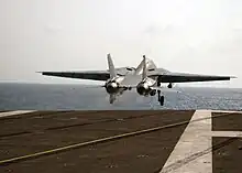 - [One of the fighters banks right and drops back behind the F-14]
